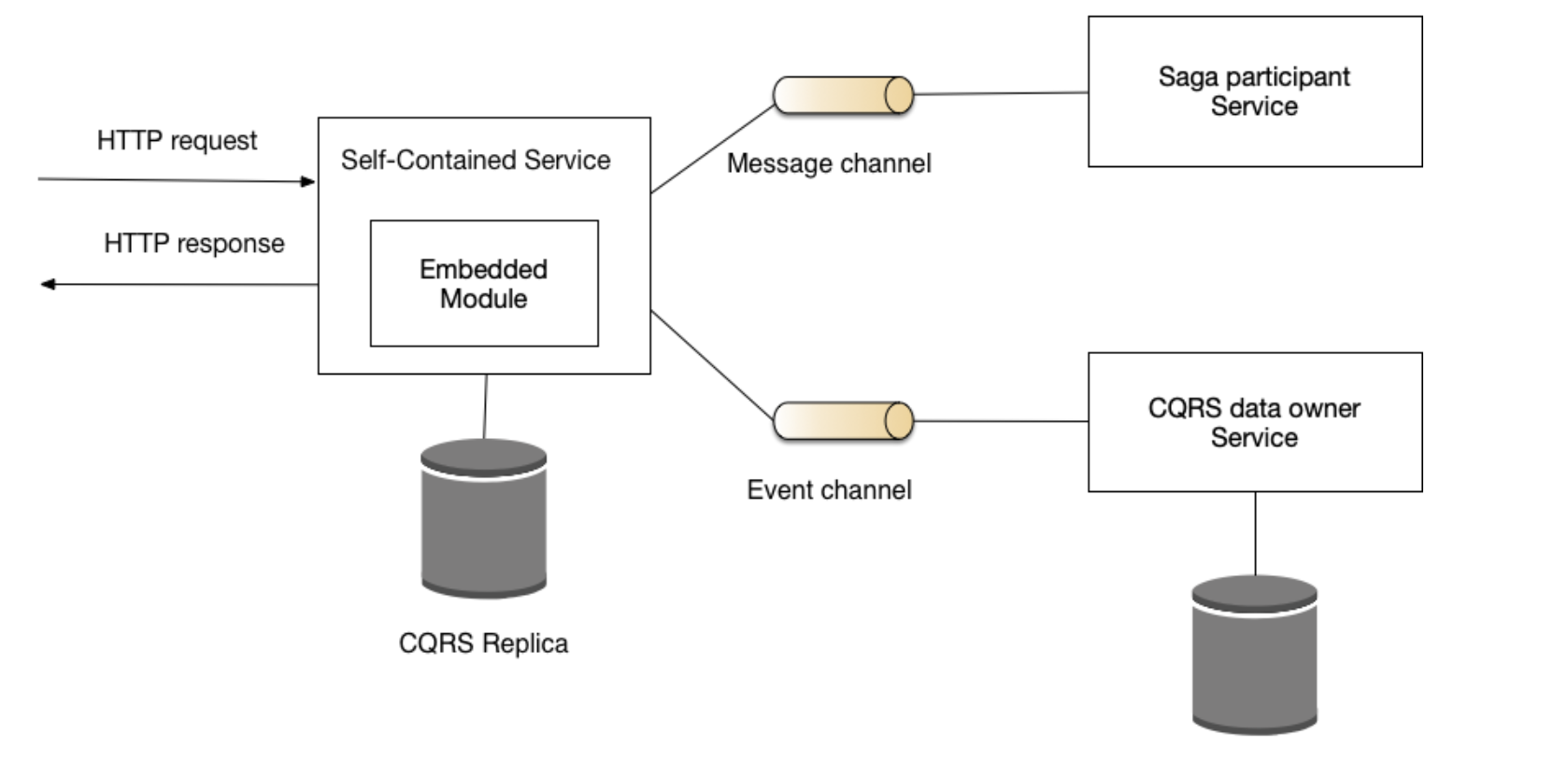使服务自包含的另一种方法是使用CQRS和Saga模式与其他服务协作。自包含服务使用 Saga 模式异步维护数据一致性。它使用 CQRS 模式来维护其他服务拥有的数据的副本。