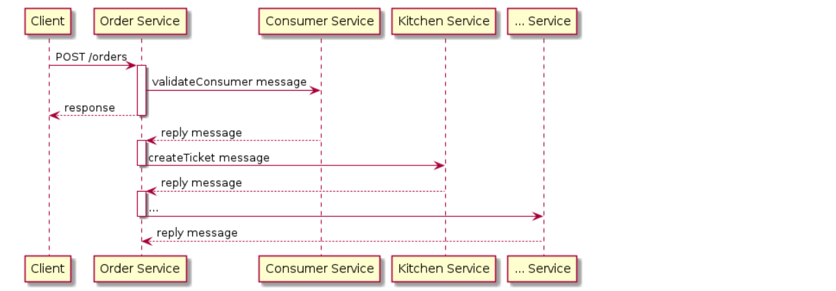 Order Service前面描述的 该 应用程序中的 是自包含服务的示例。createOrder()例如,该操作会查询拥有的数据的 CQRS 副本Restaurant Service以验证订单并为其定价,然后启动 saga 以完成订单的创建。