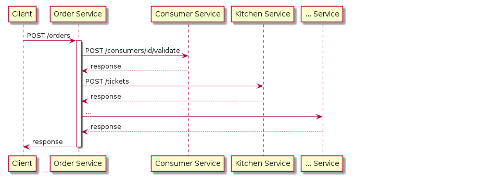 考虑一下一家外卖公司 应用程序,它是一个在线食品配送应用程序。应用程序的客户端通过发出 HTTPPOST /orders请求来创建订单,并期望在 600 毫秒内得到响应。由于 该 应用程序使用微服务架构,实现订单创建的职责分散在多个服务中。POST请求首先被路由到,然后Order Service它必须与以下服务协作: