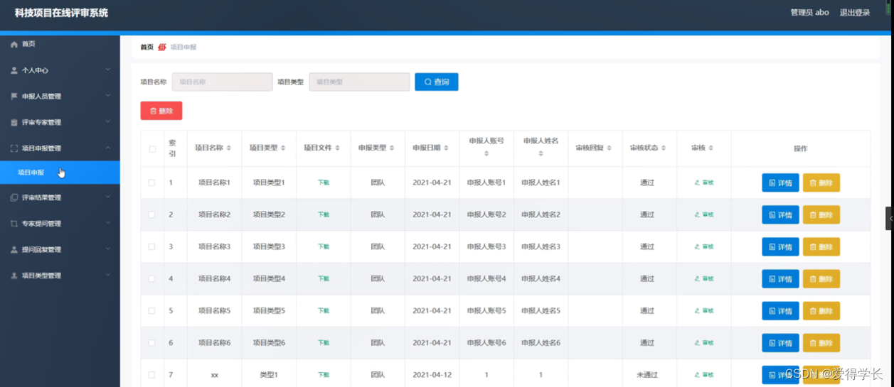 项目申报管理,在项目申报管理页面中可以对索引、项目名称、项目类型、项目文件、申报类型、申报日期、申报人账号、申报人姓名、审核回复、审核状态、审核等信息进行详情或删除等操作,如图5-5所示。