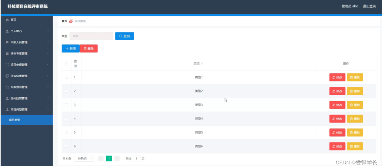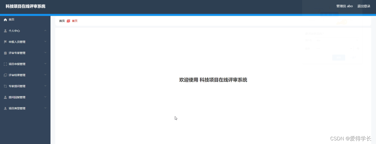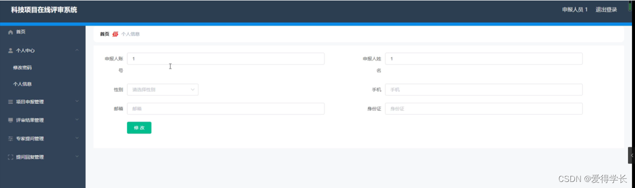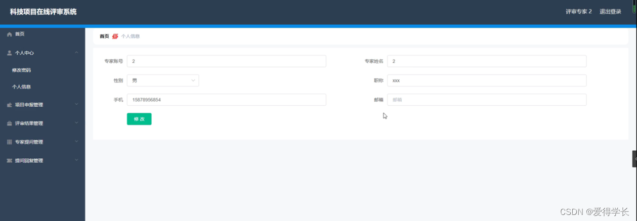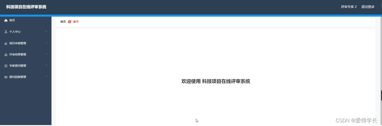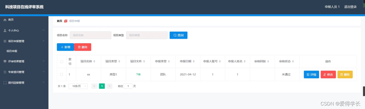 科技项目在线评审系统,主要的模块包括首页、个人中心、申报人员管理、评审专家管理、项目申报管理、评审结果管理、专家提问管理、提问回复管理、项目类型管理等功能。