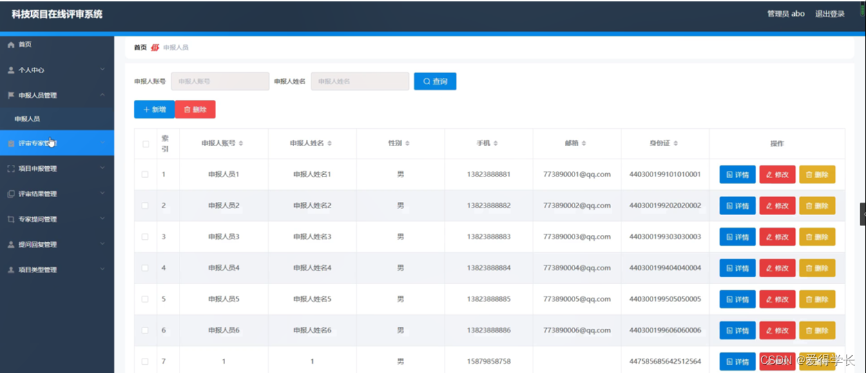 申报人员管理,在申报人员管理页面中可以对索引、申报人账号、申报人姓名、性别、手机、邮箱、身份证等信息进行详情,修改或删除等操作,如图5-3所示。