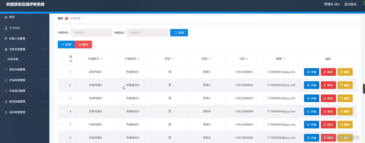 评审专家管理,在评审专家管理页面中可以对索引、专家账号、专家姓名、性别、职称、手机、邮箱等信息进行详情,修改或删除等操作,如图5-4所示。