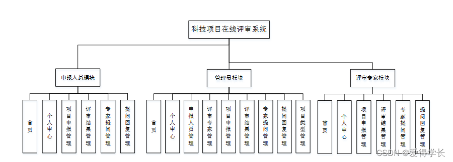 系统架构图属于系统设计阶段,系统架构图只是这个阶段一个产物,系统的总体架构决定了整个系统的模式,是系统的基础。科技项目在线评审系统的整体结构设计如图4-2所示。