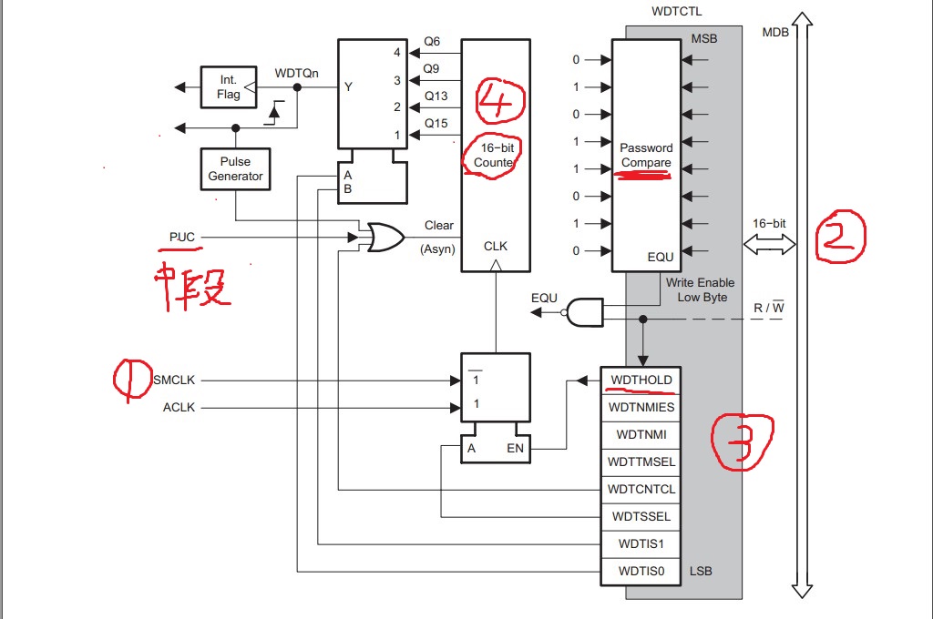 紧接着看标志3,16位的低八位,单片机看门狗的操作模块,注意430的单片机通常情况下大概是32毫秒实现一次复位,如果真的要使用的话,就要在32毫秒之内进行喂狗操作,具体的要看datasheet中的定义,这里只是插入图片