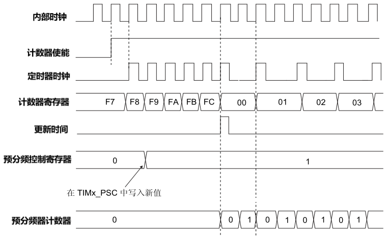 假设计数器寄存器数值为0xFC,采用2预分频,当使能计数器后,定时器时钟开始按照定时效果运行(定时由计数器寄存器和预分频器寄存器共同决定),计数器从0x00计数到0xFC后会产生中断,并更新时间开始新一轮的计数,从0x00计数到0xFC时间的长短由预分频控制寄存器决定,时序图如下所示:
