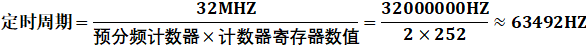 数器寄存器数值为0xFC(十进制:252),采用2预分频的定时周期计算如下(假设使用32MHZ的时钟频率):