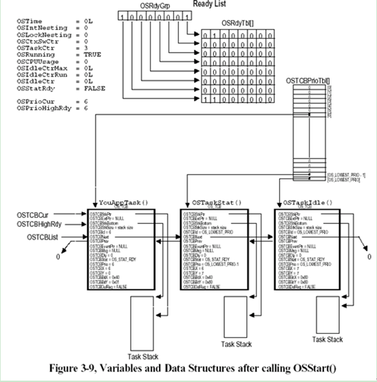 我们先不看创建的任务是什么,而且这个图是从书上截取的,把这张图放到这个地方的原因是让我们知道OSTCBPrioTbl这个数组,以及TCB之间是怎样一种逻辑结构。OSTCBPrioTbl这个数组是一个索引数组,用于优先级的快速查找TCB。比如你知道一个优先级为3,那OSTCBPrioTbl[3]里的指针指向的就是优先级为3的任务控制块。那么再看这些TCB控制块是什么逻辑结构,这些控制块连接成双向链表,这个双向链表的头是OSTCBList。