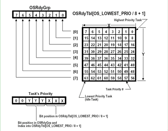 3, 为了实现快速查找,作者又增加了一个变量OSRdyGrp,某一位置一表示这一组内有就绪的任务,否则没有就绪任务。比如,OSRdyGrp的值为00000011就表示第0组和第一组都有就绪任务,在这种情况下肯定第0组的任务优先级高。也就是说第一个遇到1的位的位置代表的是优先级高的任务所在的组。同样的道理,OSRdyTbl[0]的值假设是00110010这个数第一个位置是1(都是从0开始数)。那就代表第零组的第一个任务就绪了,而且是优先级最高的。现在看来,最主要的问题是找第一个1,因为它的位置代表的优先级最高(也即代表的数值最小,其他的数值肯定比这个数值大)。为了快速的知道OSRdyGrp和OSRdyTbl[OSRdyGrp]第一个1在什么位置,我们建立了一个数组OSUnMapTbl[256],这个数组的下标是无符号8位变量的所有值,即OSRdyGrp或者OSRdyTbl[OSRdyGrp]的所有取值情况,而数组的内容是这个数的第一个1的位的位置(从右边数)。这样根据OSRdyGrp和OSRdyTbl[OSRdyGrp]的值就直接可以通过查表OSUnMapTbl[256]和简单的计算就能的到最高优先级的数值了。计算方法是通过OSRdyGrp这个索引查到的数值乘以8(因为每组八个)加上通过OSRdyTbl[OSRdyGrp]这个索引查表得到的数。这个方法是利用了空间换取时间效率的高效算法,O(1)算法,算法复杂度不变,无论有多少任务就绪(当然现在是64个)。