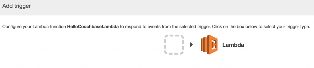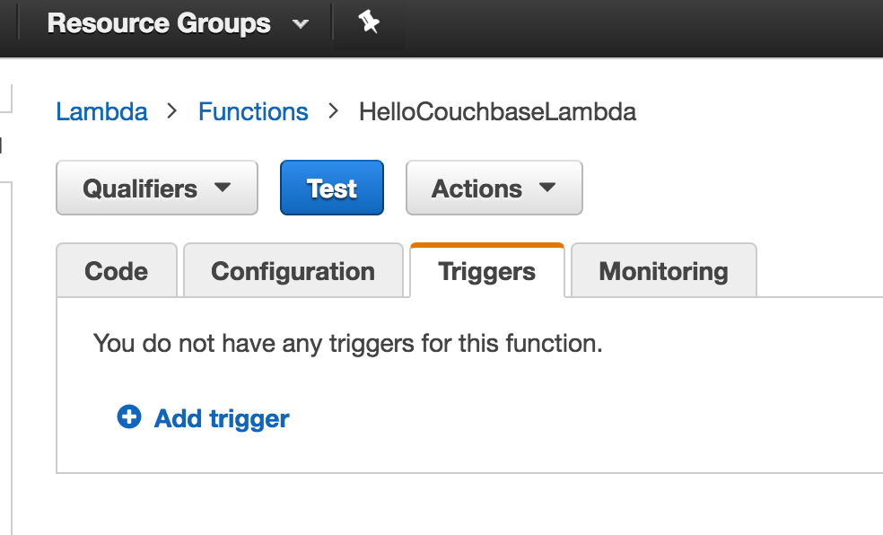 Lambda函数可以由多个事件触发。 这些事件中的任何一个发生时,都会调用Lambda函数。 默认情况下,没有触发器与Lambda函数关联。 对于我们的HelloCouchbaseLambda函数,可以在us-west-2.console.aws.amazon.com/lambda/home?region=us-west-2#/functions/HelloCouchbaseLambda?tab=triggers中看到。
