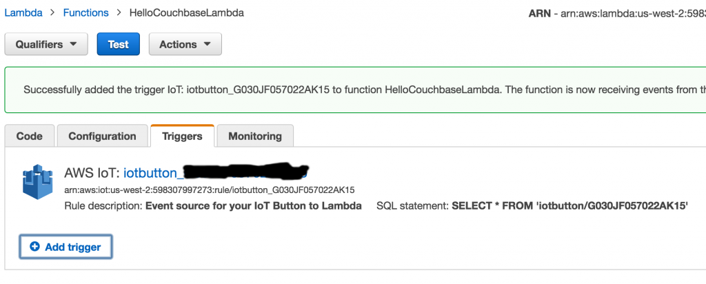 单击Iot按钮将调用HelloCouchbaseLambda Lambda函数。 此功能使用Couchbase Java SDK在Couchbase中创建JSON文档。