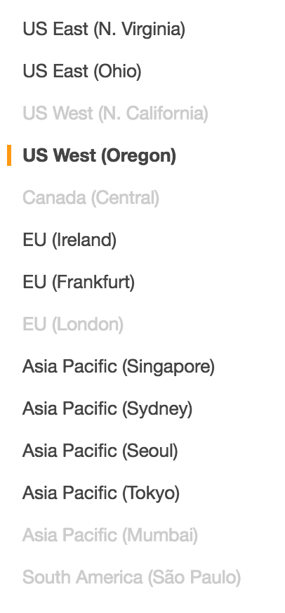 以下列表以灰色显示了不支持的区域列表:
