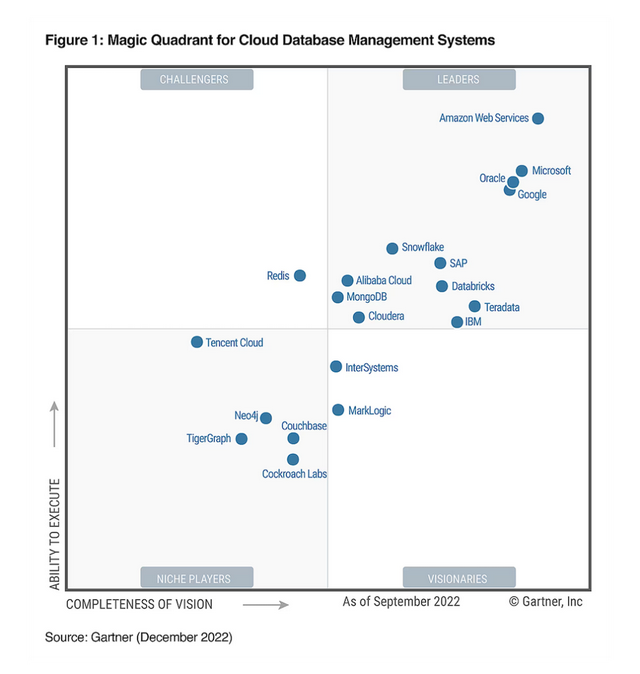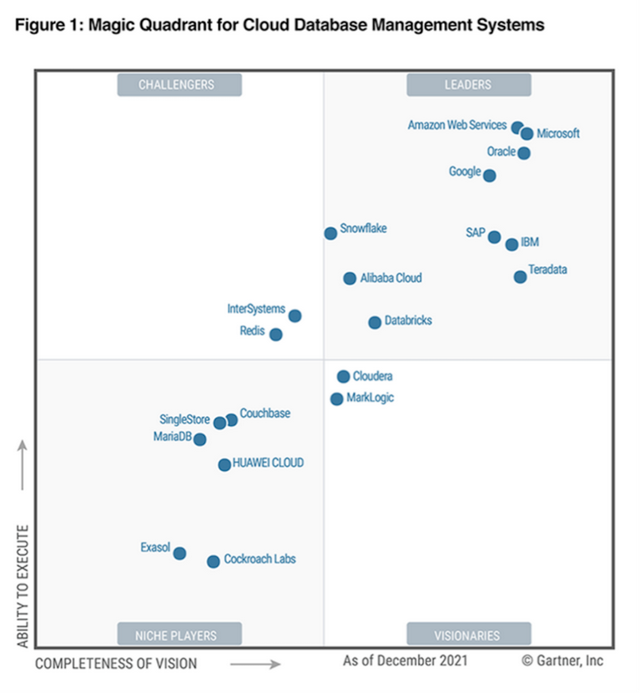 不过,仔细一点点的朋友不难看出,Teradata在云数据库管理系统(DBMS)魔力象限中领导者区间的表现2021年明显要比2020年和2022年要好一些,2022年基本又退步到了2020年的区间位置。