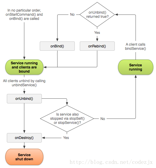 (4)unbindService:调用onUnbind()->onDestory() 此时Service关闭!