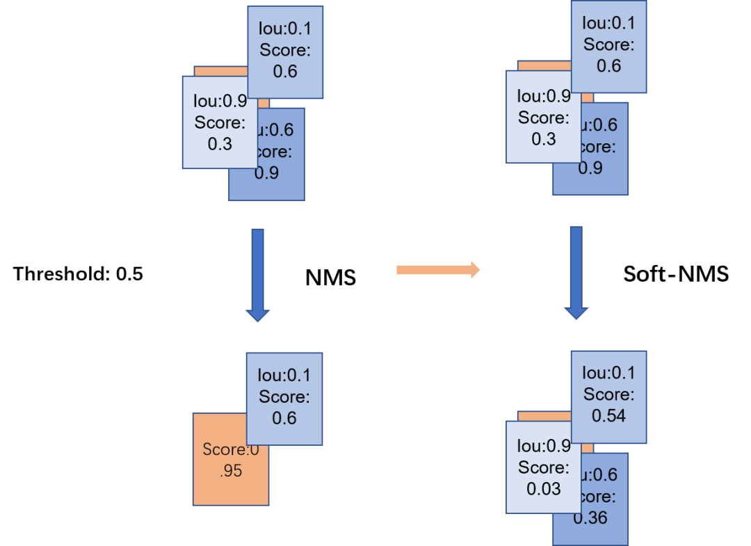 Soft-NMS将重叠率大于设定阈值的框分类置信度降低,而不是直接置为0,可以增加召回率。