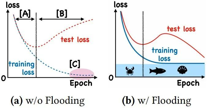 Flooding方法:当training loss大于一个阈值时,进行正常的梯度下降;当training loss低于阈值时,会反过来进行梯度上升,让training loss保持在一个阈值附近,让模型持续进行“random walk”,并期望模型能被优化到一个平坦的损失区域,这样发现test loss进行了double decent!