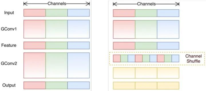 将组卷积的输出feature map的通道顺序打乱,增加不同组feature map的信息交互。