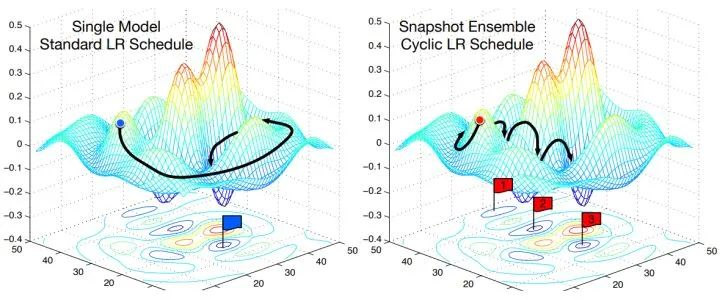 每隔一段时间重启学习率,这样在单位时间内能收敛到多个局部最小值,可以得到很多个模型做集成。