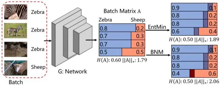 类别预测的判别性与多样性同时指向矩阵的核范数,可以通过最大化矩阵核范数(BNM)来提升预测的性能。