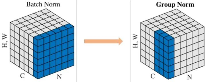 在小batch size下BN掉点严重,而GN更加鲁棒,性能稳定。