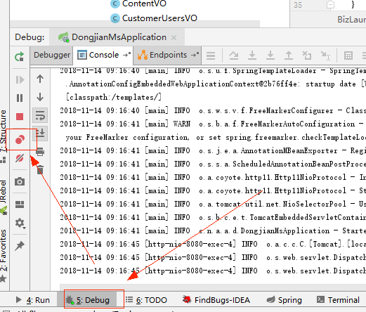 3,解决方法:如图所示,在idea底部操作拦中选择“Debug",然后点击如图左侧栏所示两个重叠的红色圆圈