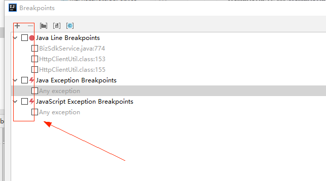 并在弹出框中取消全部断点的选中,改为非选中状态即可。