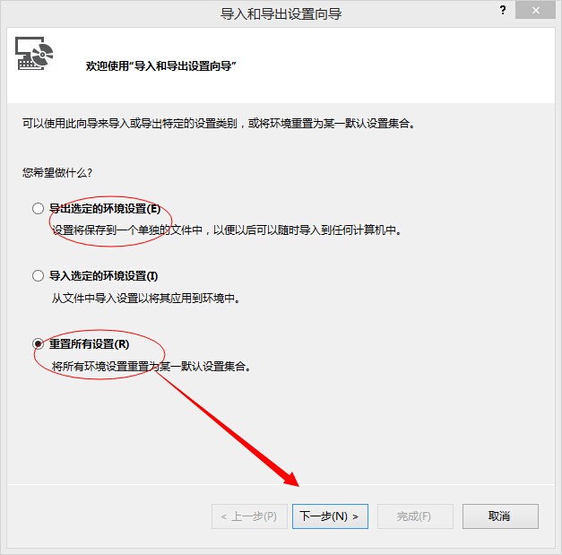 其次:可以先导出选定的环境设置,已做备份。然后选中“重置所有设置”。将所有环境设置重置为某一默认设置集合。