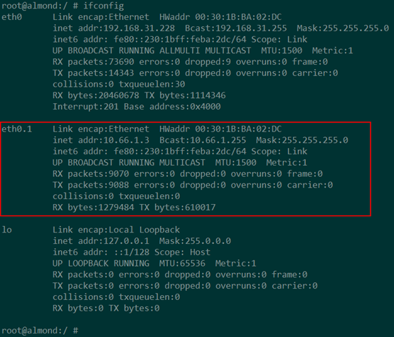 648中延用638中方法在有线网络接口eth0上创建虚拟网卡eth0.1并设置ip 10.66.1.3用以与410地址10.66.1.2通信。