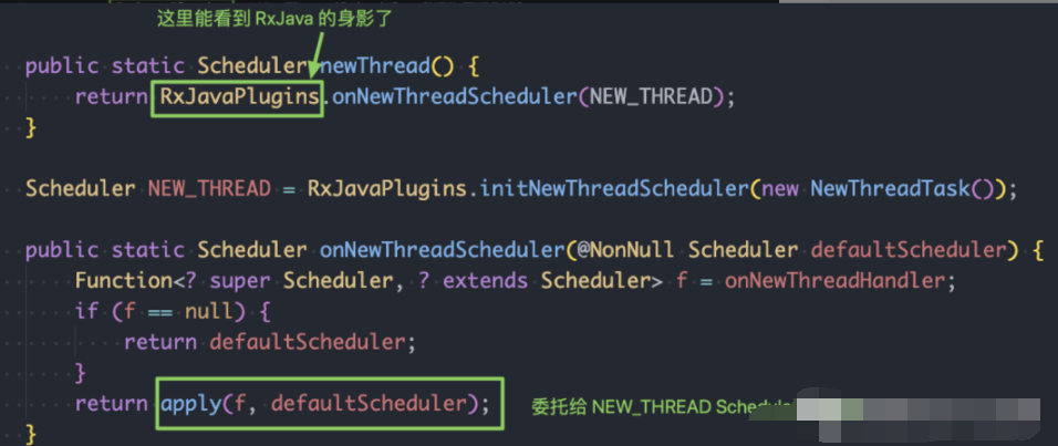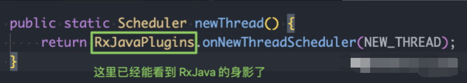 在Schedulers.newThread() 方法中,看到了 RxJava 的身影,真正的处理逻辑,交给 newThreadScheduler 去处理: