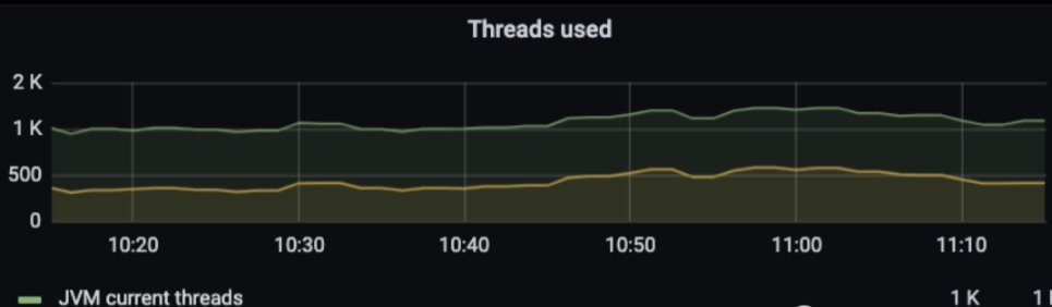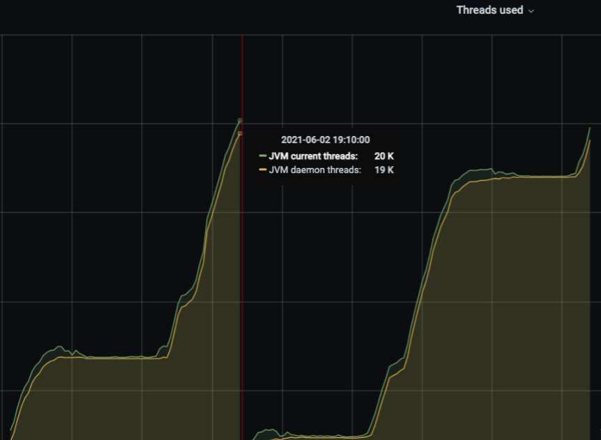出了问题后,我们第一时间查看了Jenkins 监控大盘,从监控大盘可以看到,JVM 线程数量飙升得很厉害,最高达 20K: