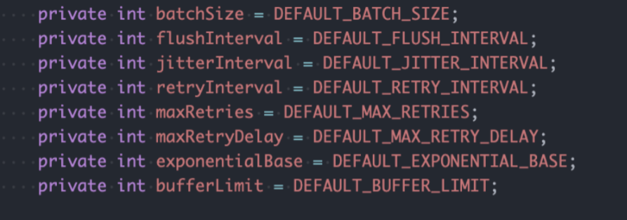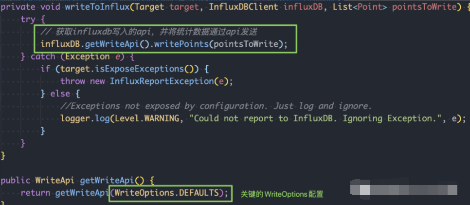 获取 influxdb 写入的api,并将统计数据通过api发送 比较关键的就是这个写 API 的配置:WriteOptions.DEFAULTS,我们看下他具体的配置:
