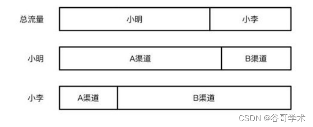 35%的流量。小明服装店的总流量中只有30%的流量是在B渠道中获得的,而小