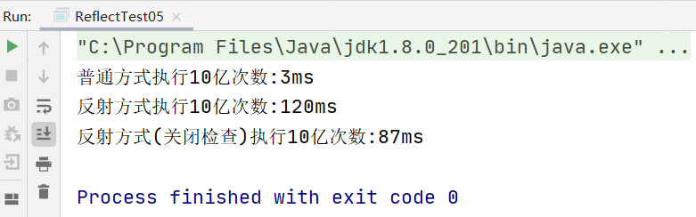 System.out.println("反射方式(关闭检查)执行10亿次数:" + (endTime - startTime) + "ms");