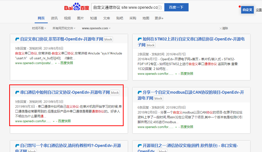搜索关键字后面 加上 site: 最后面填写指定搜索范围的网址。比如我的文章是在openedv这个论坛中写的,那么搜索的关键字就要写 " 自定义通信协议 site: www.openedv.com "