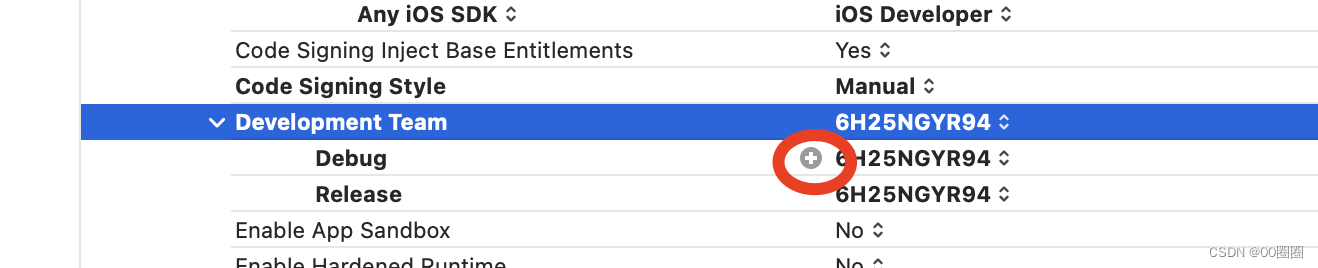 将Development Team 里原有的组织名称删掉(如果有的话,把鼠标放在Team上,还出现一个减号按钮) PS:下图展示的是+号,因为我已经删除过了。