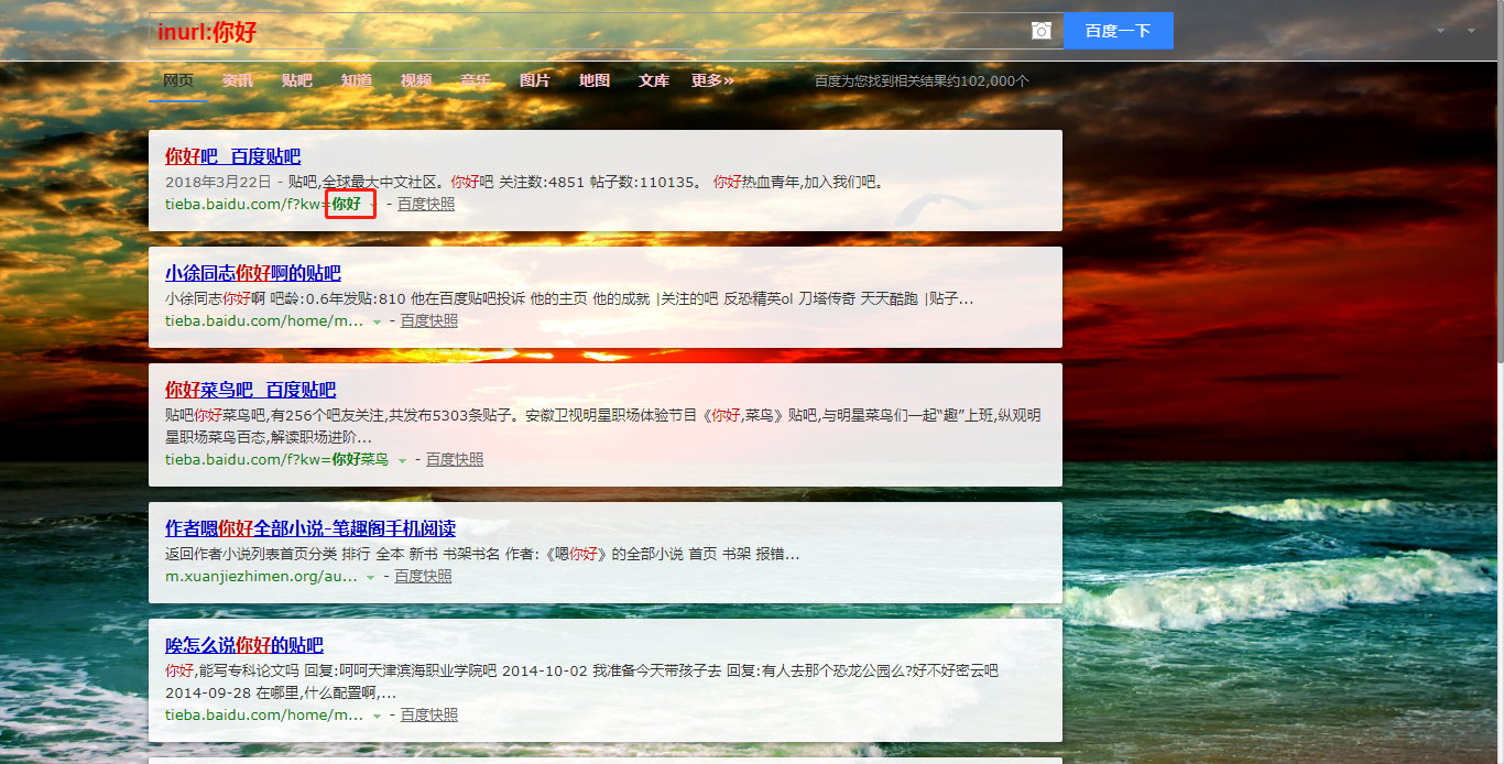 实例演示:如下搜索,网址里肯定包含"你好"这两个中文字。