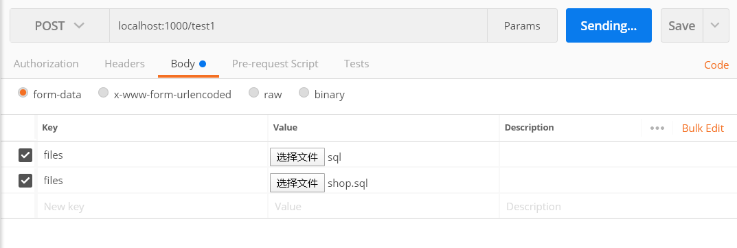 除了body中form-data选中外,其它都为空,并且将key设置为与controller中接口的参数名一致,多个文件的话,postman中的多个key设置一致即可,并设置为file,value选中文件。