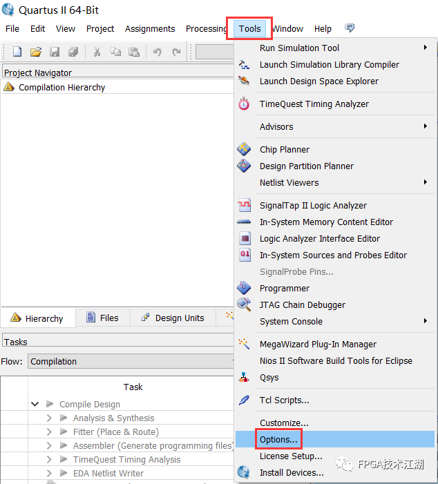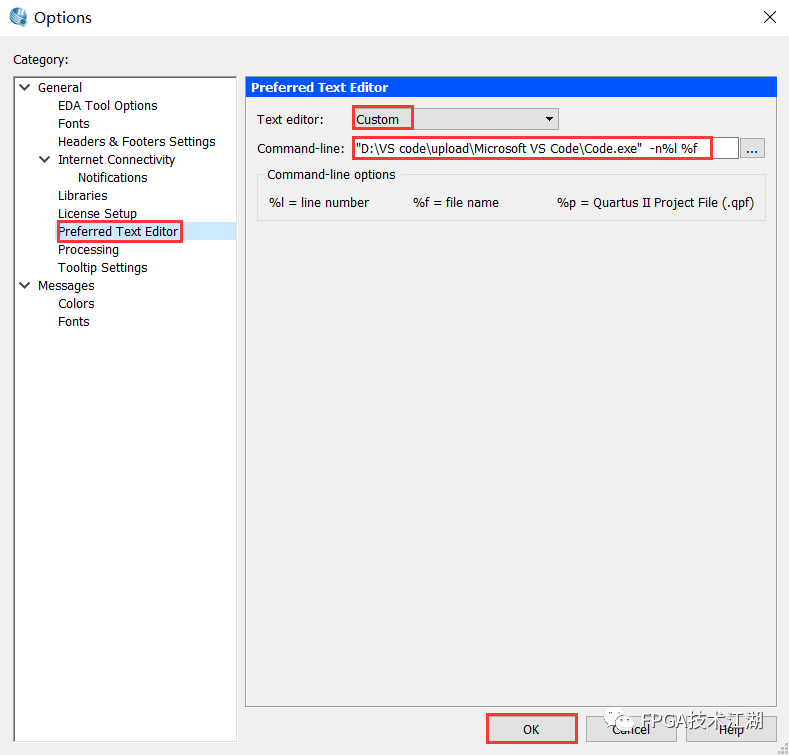 在Quartus 中可以按以下设置进行关联Vs Code。首先点击Tools,选择Options,然后在Preferred Text Editor选项中选择Custom进行自定义链路关联,同样复制安装VS code的路径后填入,在Code.exe后需加入 -n%| %f,最后点击OK应用。