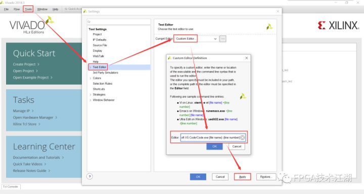 在Vivado中可以按以下设置进行关联Vs Code。首先点击Tools,选择Text Editor,然后进行自定义链路关联,复制安装VS code的路径后填入,在Code.exe后需加入[file name] -[line number],最后点击Apply应用。