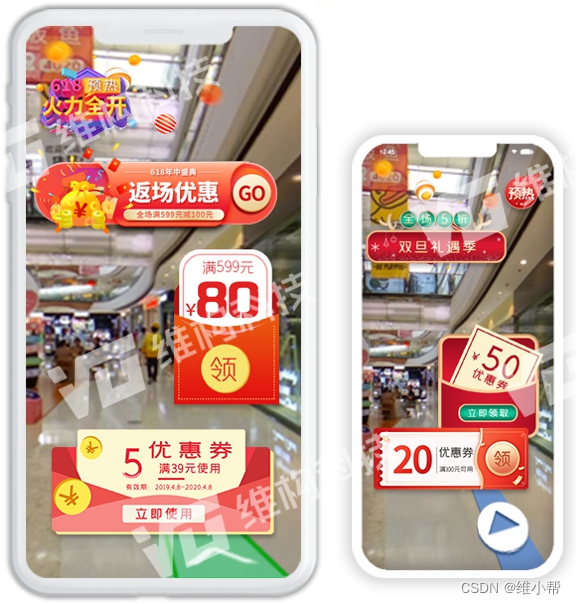 手机端可实现VR实景导航,1:1复刻线下商场实景,并配置虚拟图标指引,轻松指引路线,在实景导航过程中,还能看到途中门店投放的优惠活动,让导航过程也能获得趣味体验!