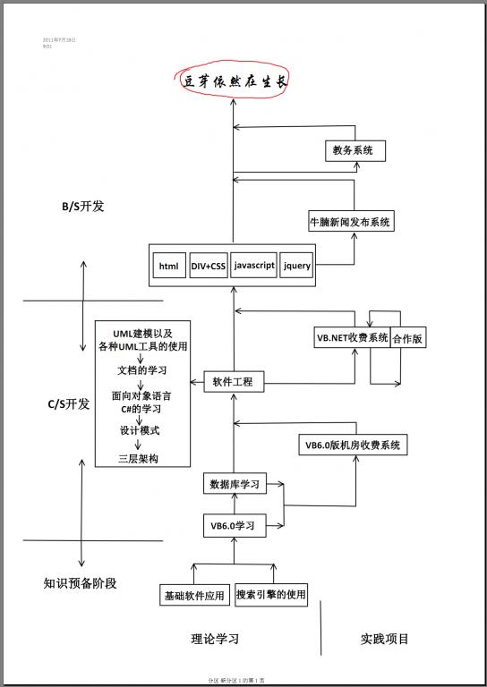 纵观自己的学习过程俨然就是一个软件开发过程的放大图,同时也是软件工程发展的缩小图。整个的学习过程:先理论后实践,在实践中去体会理论、完善理论。最后,配一图简要表述一下学习计算机以来的整个学习过程。