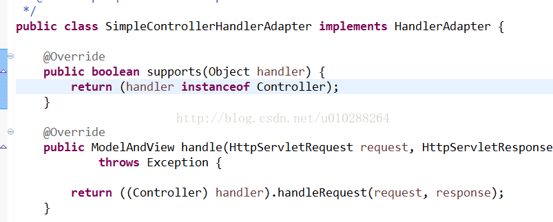 supports()方法传入处理器(宽泛的概念Controller,以及HttpRequestHandler,Servlet,等等)判断是否与当前适配器支持如果支持则从DispatcherServlet中的HandlerAdapter实现类中返回支持的适配器实现类。handler方法就是代理Controller来执行请求的方法并返回结果。