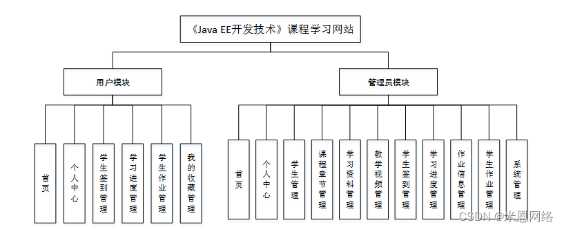 系统架构图属于系统设计阶段,系统架构图只是这个阶段一个产物,系统的总体架构决定了整个系统的模式,是系统的基础。《Java EE开发技术》课程学习网站的整体结构设计如图4-2所示。