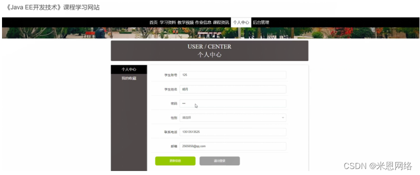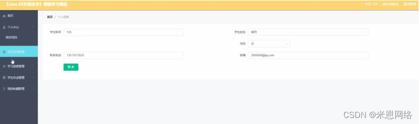 个人中心,在个人中心页面中通过填写学生账号、学生姓名、性别、联系电话、邮箱等信息进行修改,如图5-7所示。