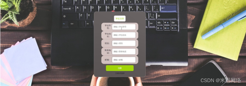 学生注册,在学生注册页面通过填写学生账号、学生姓名、密码、联系电话、邮箱等信息完成注册,如图5-4所示。在个人中心页面通过填写学生账号、学生姓名、密码、性别、联系电话、邮箱等进行更新信息操作,还可以根据需要对我的收藏进行相应操作;如图5-5所示。