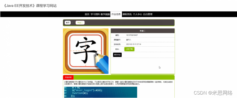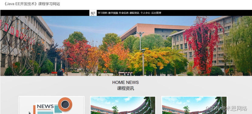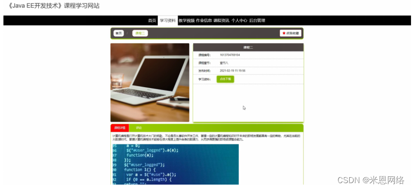 《JAVA EE开发技术》课程学习网站,在网站首页可以查看首页、学习资料、教学视频、作业信息、课程资讯、个人中心、后台管理等内容,如图5-1所示。