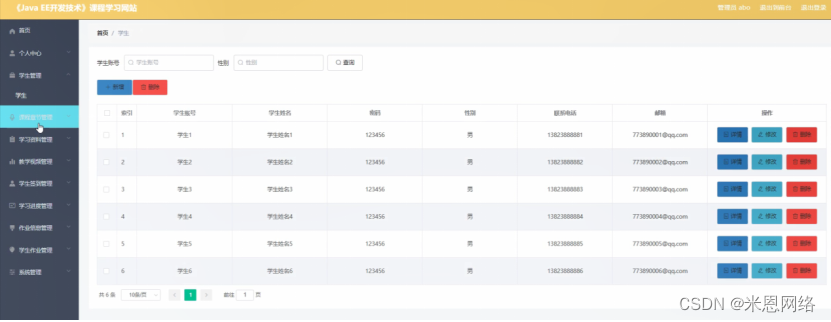 学生管理,在学生管理页面中可以对索引、学生账号、学生姓名、密码、性别、联系电话、邮箱等内容进行详情、修改或删除等详细操作,如图5-11所示。