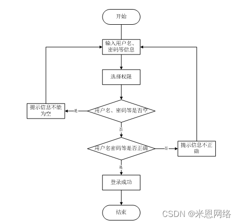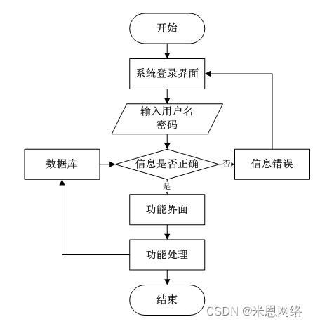 用户打开并进入系统后,会先显示登录界面,输入正确的用户名和密码,系统自动检测信息,若信息无误,则用户会进入系统功能界面,进行操作,否则会提示错误无法登录,操作流程如图3-3所示。