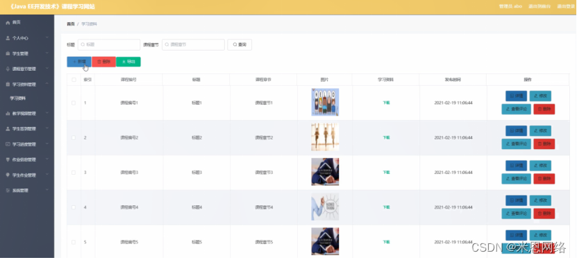 学习资料管理,在学习资料管理页面中可以对索引、课程编号、标题、课程章节、图片、学习资料、发布时间等内容进行详情、修改、查看评论或删除等详细操作,如图5-13所示。