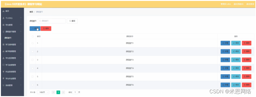 课程章节管理,在课程章节管理页面中可以对索引、课程章节等内容进行详情、修改或删除等详细操作,如图5-12所示。